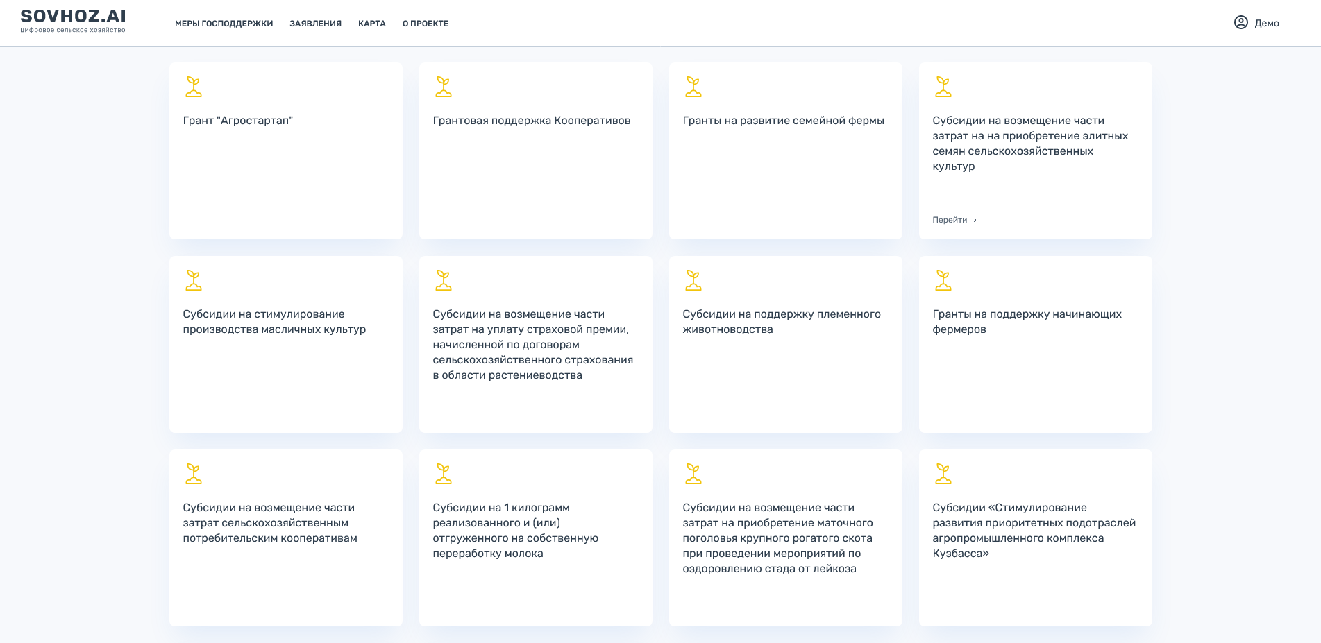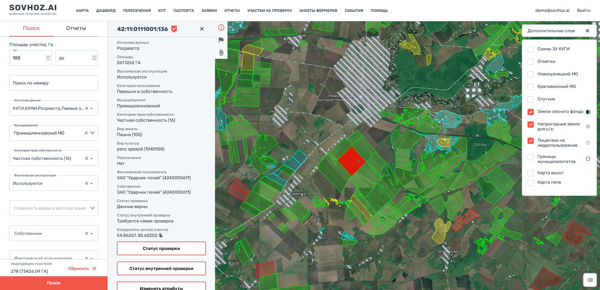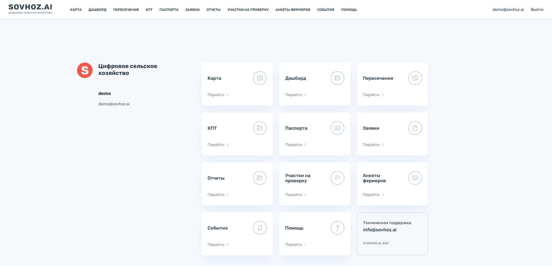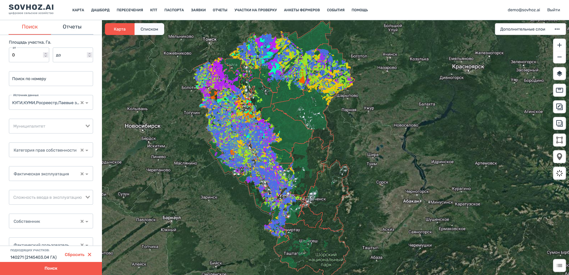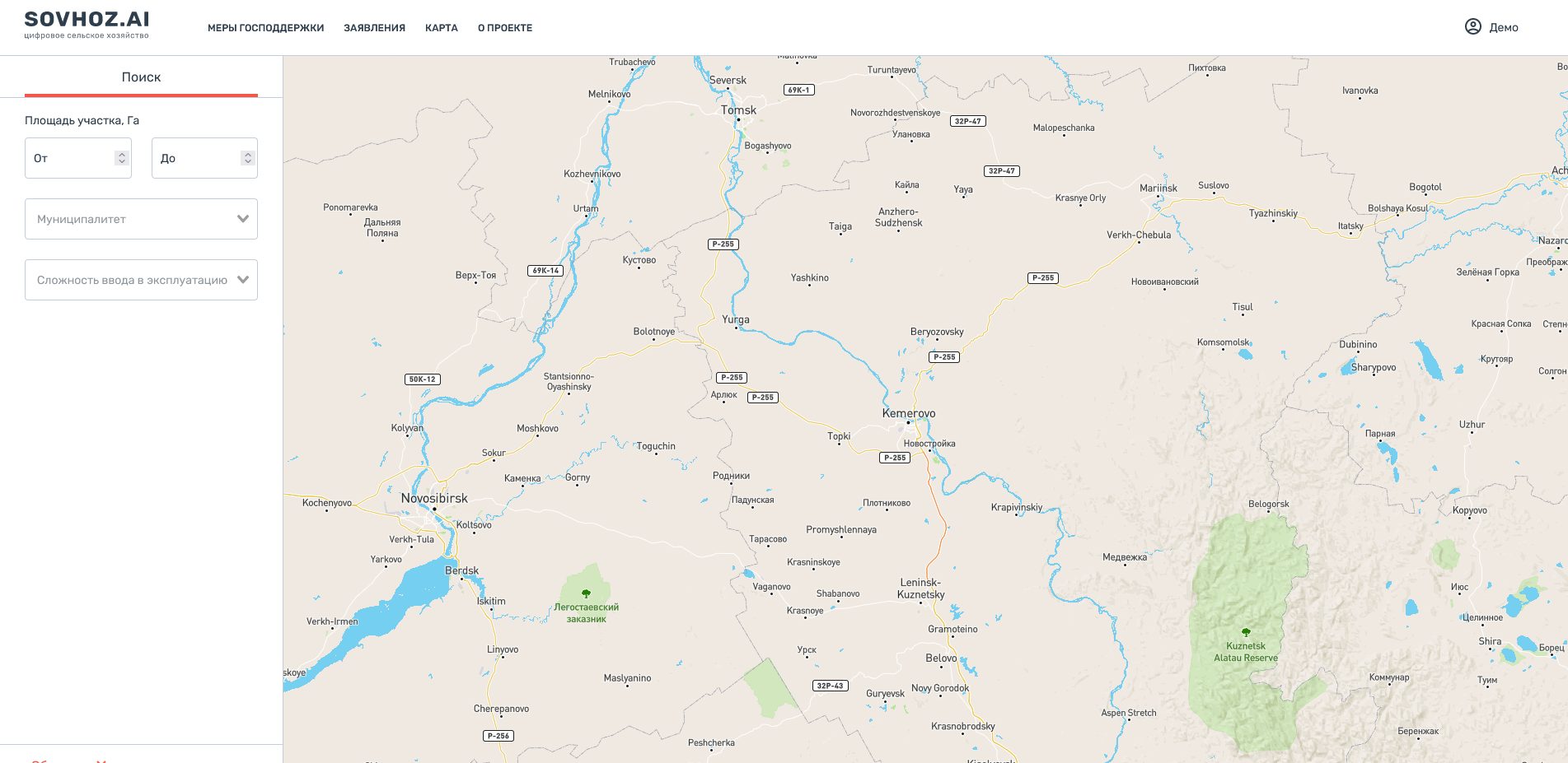 Цифровая платформа по управлению землями сельскохозяйственного назначения "Sovhoz.ai" - веб-сервис, позволяющий на основе региональных межведомственных данных о землях сельскохозяйственного назначения вести учёт границ, атрибутивных данных земельных участков, осуществлять их мониторинг, получать статистику по состоянию земель сельскохозяйственного назначения Кемеровской области-Кузбасса.