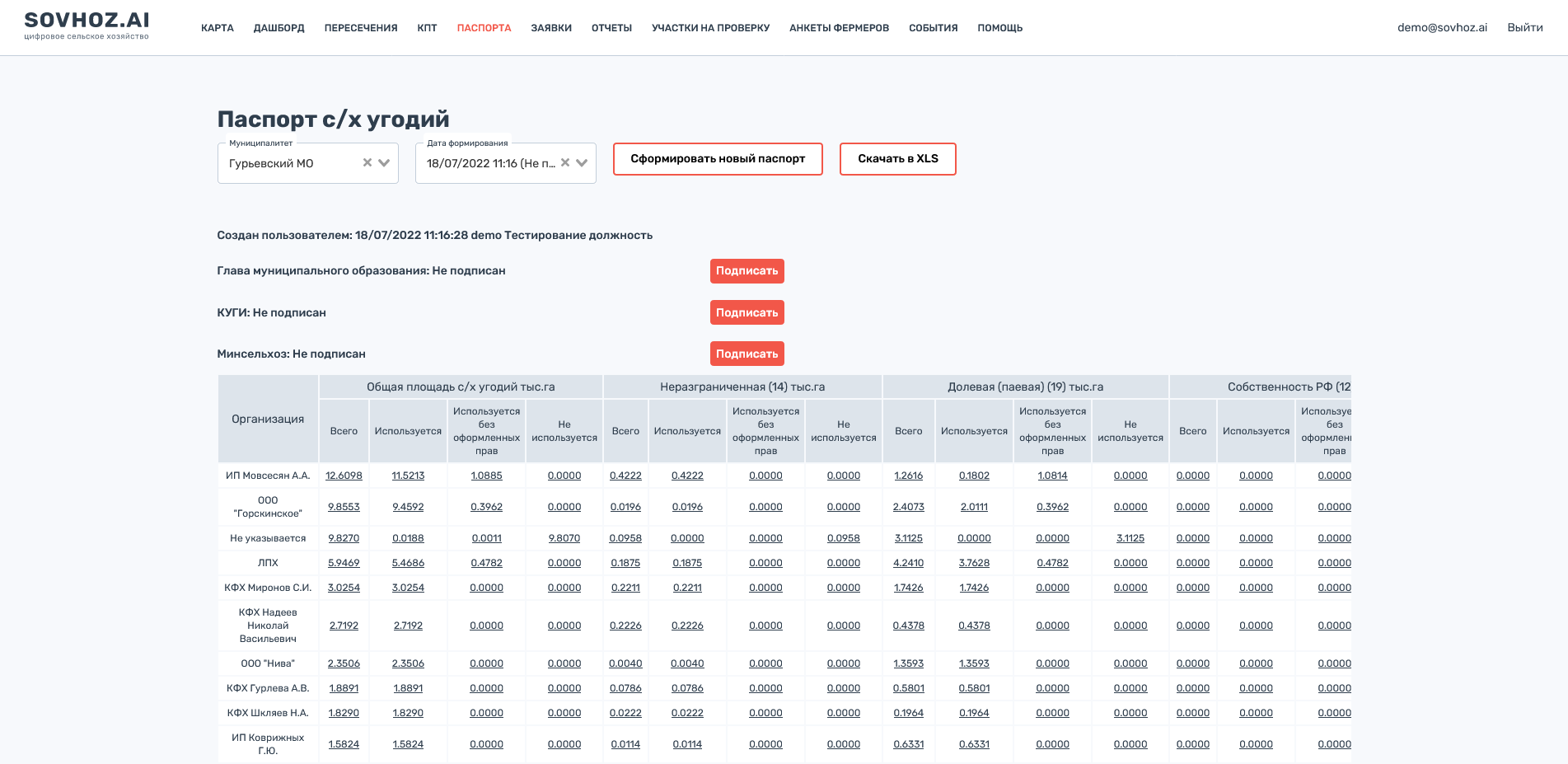 Модуль “Паспорта” предназначен для создания, подписания и скачивания паспортов сельскохозяйственных угодий муниципалитета или области. Каждое значение в паспорте является активной ссылкой и позволяет удостовериться в точности данных.