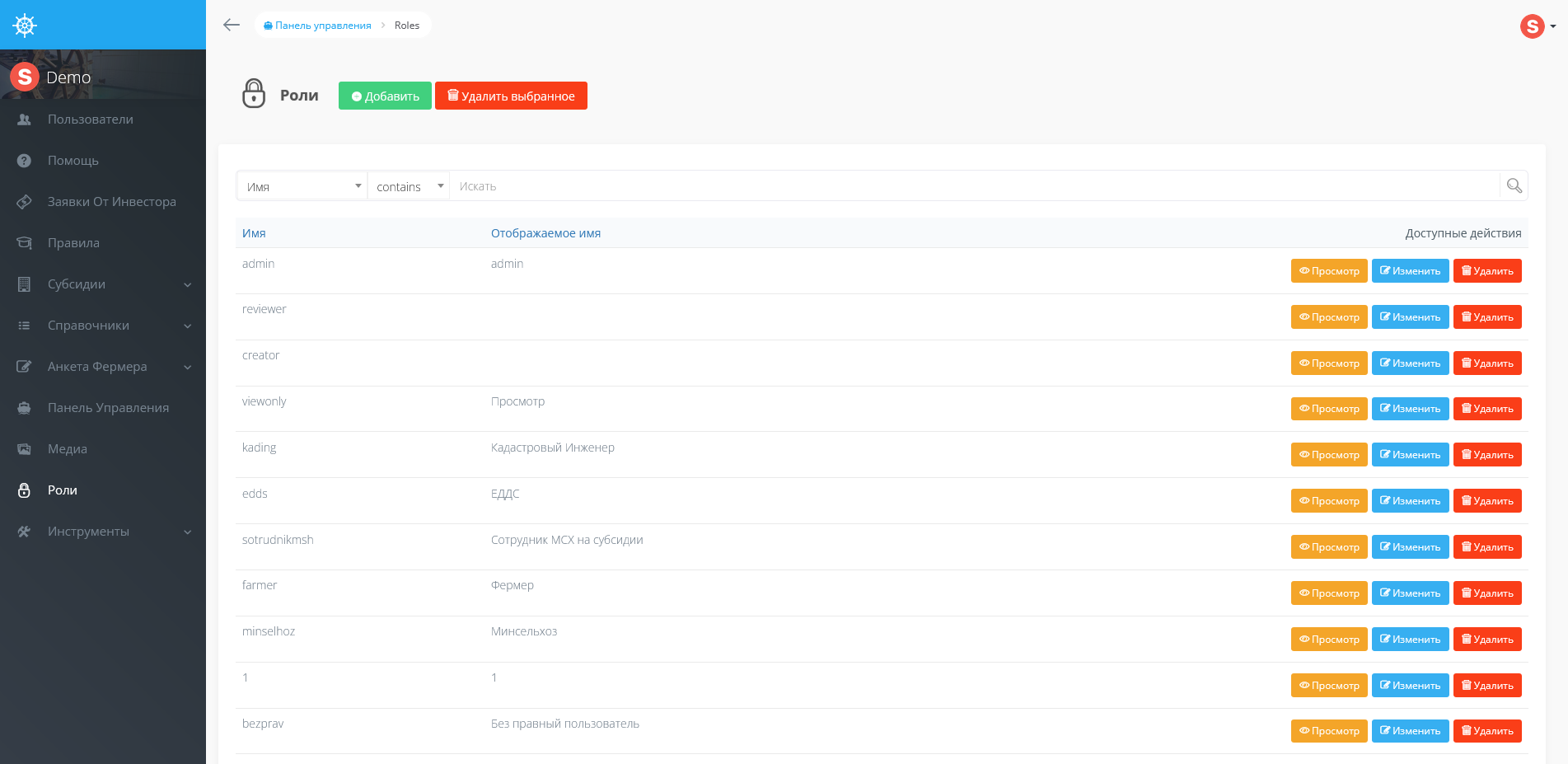 Этот компонент доступен разработчикам и менеджеру сайта. Панель администратора предназначена для создания учетных записей, назначения ролей в соответствии с его принадлежностью какой-либо из структур (КУГИ, КУМИ, сельское хозяйство), размещения информации об актуальных мерах господдержки сельского хозяйства, редактирования анкеты, а также инструменты, обеспечивающие непрерывную работу платформы.