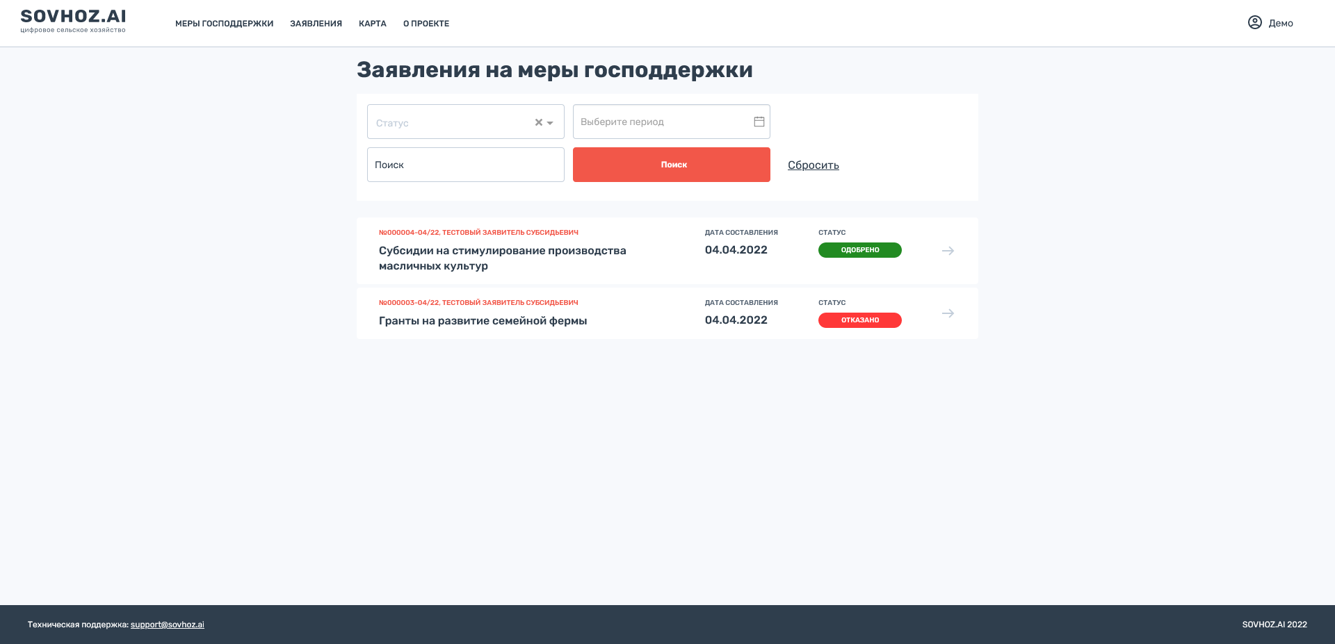 Модуль “Заявления” позволяет пользователю отслеживать статус заявок на меры господдержки, загружать необходимые документы, выставлять статус рассмотрения заявки, производить коммуникацию между заявителем и ответственным лицом.