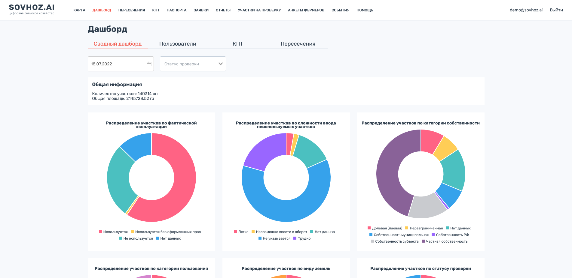 Модуль “Дашборд” предназначен для просмотра общей статистики по оцифрованным участкам, полям, работе пользователей.
