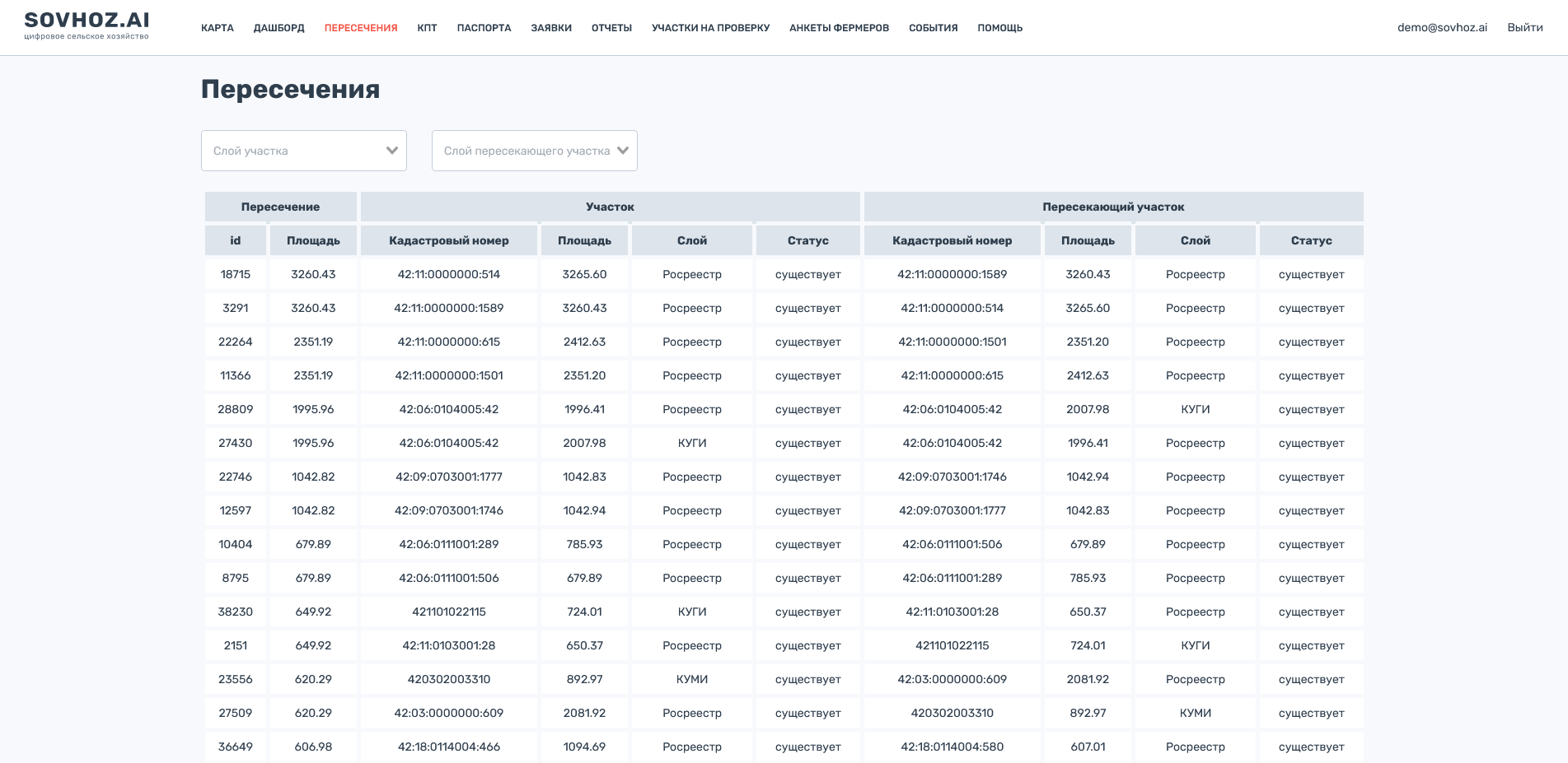 Модуль “Пересечения” предназначен для просмотра списка пересечений земельных участков и полей, что помогает получать более корректную информацию о площади земель сельскохозяйственного назначения Кемеровской области-Кузбасса.